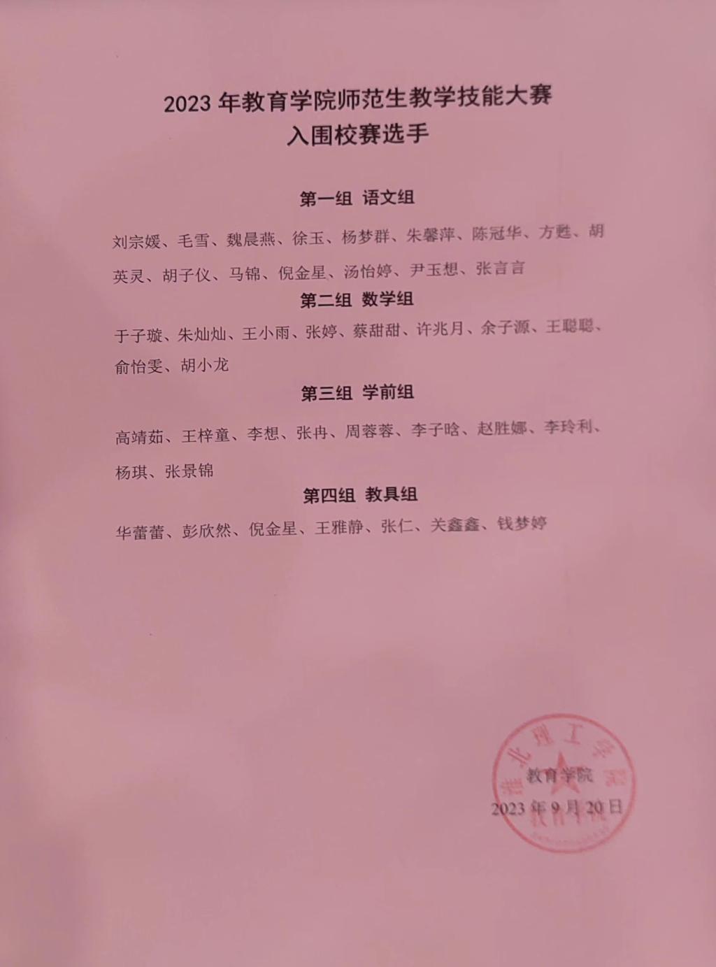 热烈祝贺我院刘宗媛、毛雪、魏晨燕、徐玉等42位同学入围师范生教学技能大赛校赛!入围校赛名单公示如下: