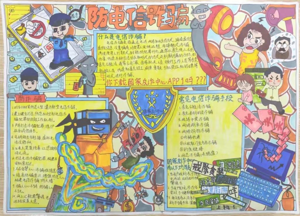 宣传增强防范之心,画纸营造反诈氛围。XK星空体育于10月上旬开展“反电诈,防电诈”手抄报活动,我院青年学子积极响应,纷纷投稿,共收到近300件作品。通过团总支微信公众号投票、评委老师打分等多轮选拔,共遴选出18份获奖作品,其中一等奖3名,二等奖5名,三等奖10名。21级学前教育1班华蕾蕾的作品以国家反诈中心标志为原型制作手抄报进行知识宣传,呼吁同学们要做到人人下载安装国家反诈中心APP。22级汉语言文学4班刘嘉诚的作品则通过顺口溜和标语告诫大家要时刻紧绷防范之弦,形式新颖有趣。同学们围绕反电诈、防电诈等相关知识,以独特的视角创作出生动形象、寓意深刻的反电诈手抄报,生动再现了网络诈骗层出不穷的手段及应对方法,有力的唤醒了全院师生反诈骗意识。