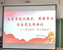为深入学习贯彻党的十九届六中全会决议精神、学习《中共中央关于党的百年奋斗重大成就和历史经验的决议》,引导全体学生党员在专业学习、组织纪律、活动参与、班级管理、宿舍建设和文化素质提升等方面发挥引领和示范作用,XK星空体育数学与应用数学与学前教育学生支部,和汉语言文学与英语学生支部分别于12月1日下午和12月3日下午在1号教学楼213教室召开支部大会,会议分别由支部书记任若晨和彭慧敏主持,所属支部的学生党员和辅导员老师参加了会议。