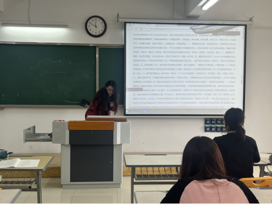 随后,全体党员集中观看了警示教育片,学生党员谢宣妍对警示教育片进行了相关讲解:强调深入贯彻落实中央八项规定精神要加强纪律教育,划出“雷区清单”;加强警示教育,用“身边案”敲打“局中人”;强化日常监督,压实主体责任;畅通诉求渠道,激活群众监督。