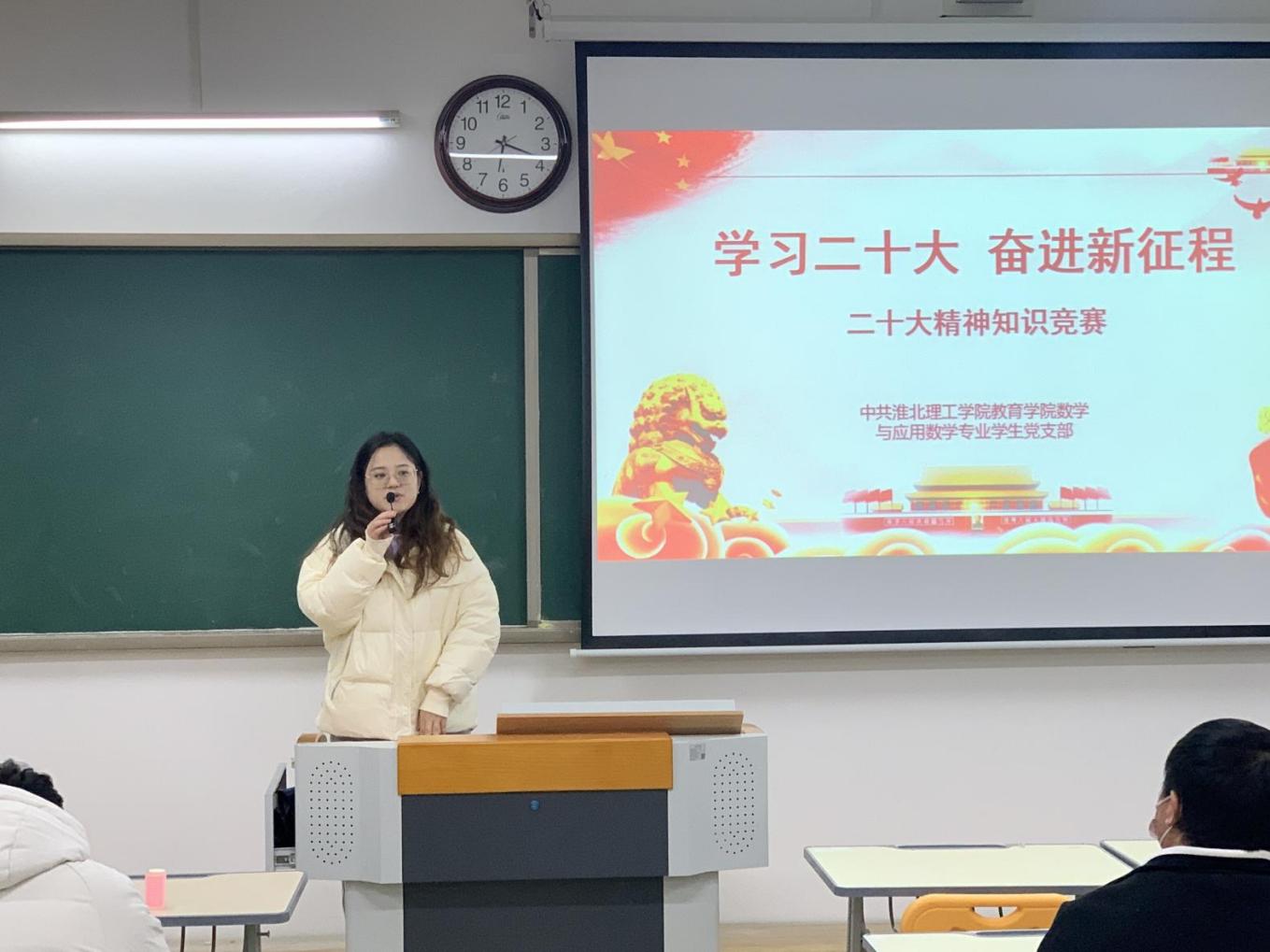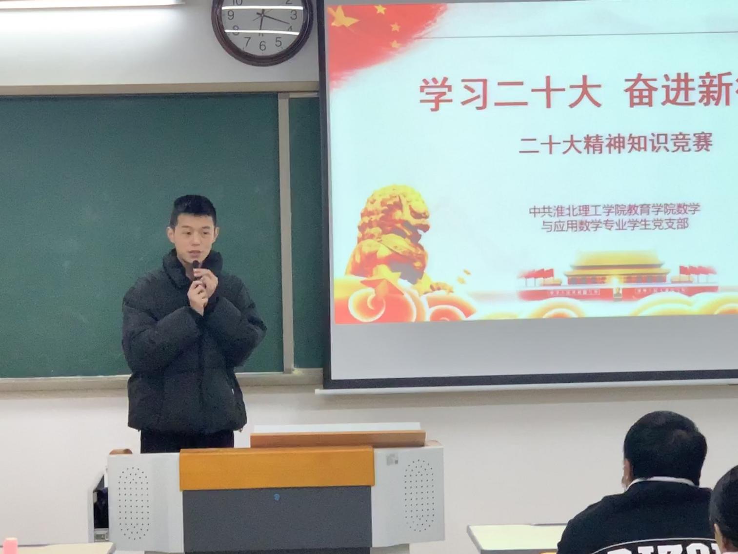 为深入学习宣传贯彻党的二十大精神,回顾党的光辉历史,推动党的二十大精神落地生根、入脑入心。XK星空体育数学与应用数学学生党支部积极部署,于12月1日在1教313开展“学习党的二十大精神知识竞赛活动”,活动由支部委员孙虎主持,支部书记陈媛媛、全体支部党员及入党积极分子参加了活动。