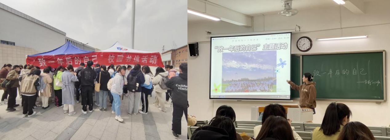为了更好地引导学生珍惜当下、规划未来,星空XKXK星空体育2023年3月15日—17日在体育馆前广场成功举办“致一年后的自己”校园书信撰写活动。活动由2022级辅导员陈慧慧老师指导,2022级学前教育(专升本)9-14班同学在校园宣传、组织。