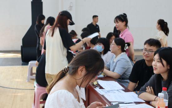 (负责身份核对的小组有条不紊地检查新生的录取通知书及相关证件)