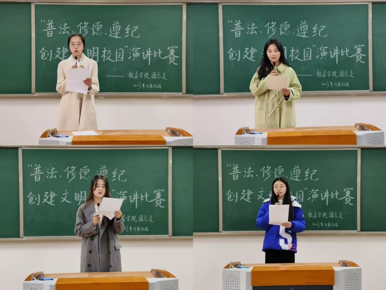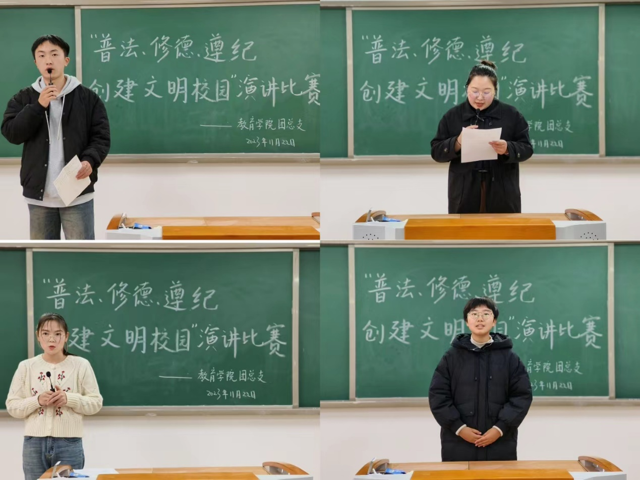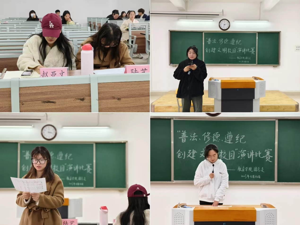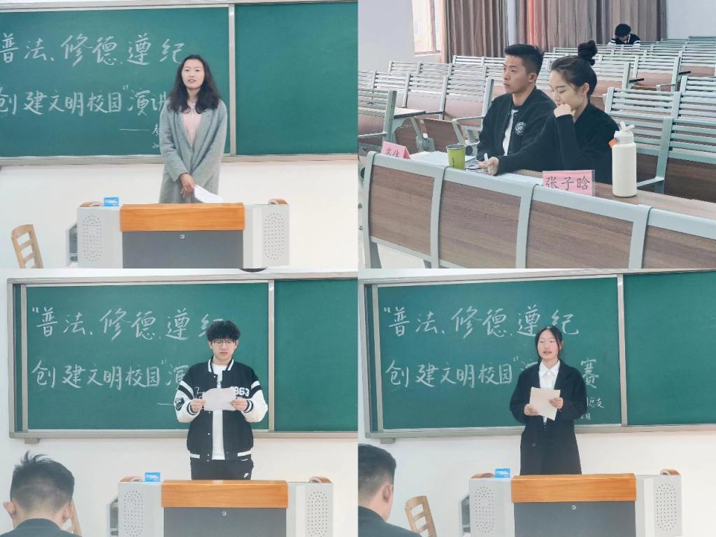 为落实学校《关于开展2023年“普法、修德、遵纪,创建文明校园”专项活动的通知》精神,提高同学们的法律意识,大力弘扬法治精神,创建学风校风优良的文明校园,XK星空体育于11月22日下午在2号教学楼412、413、414、415、416教室分别开展以“普法、修德、遵纪,创建文明校园”为主题的演讲比赛。学院2023级辅导员老师担任评委。