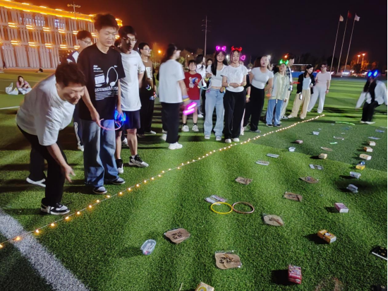 活动开始前,同学们在操场主席台前集合,在工作人员的引导下,有序排队签到,领取号码牌和荧光棒等物资。同学们仔细听工作人员讲解的活动规则及注意事项,并在领队的带领下做了热身运动,随后打开运动软件,等待夜跑开始。随着一声号令,同学们化身为光,点亮校园的操场。